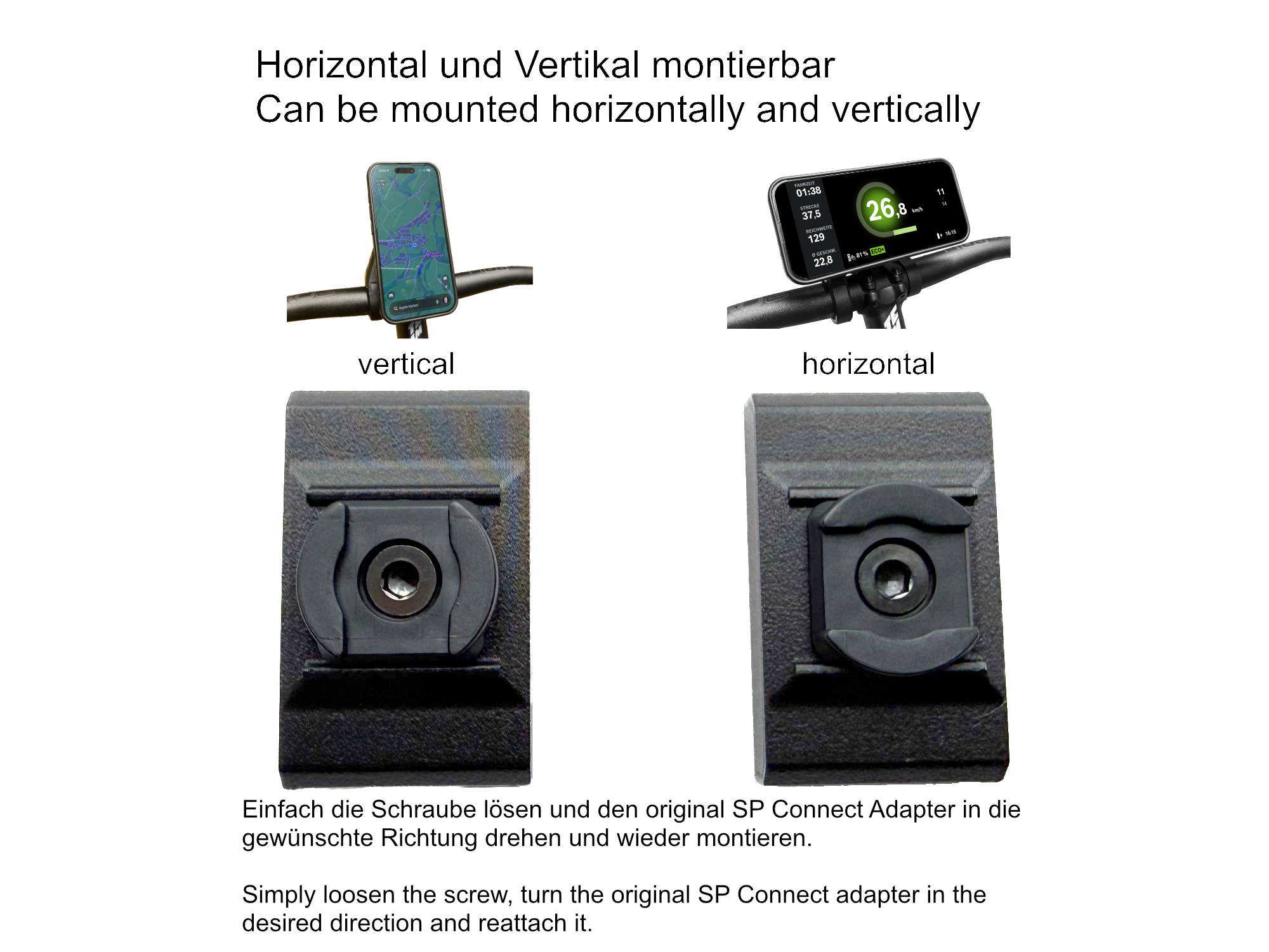 - Smartphone horizontal oder vertikal verwendbar: Dazu einfach die Schraube lösen und den original SP Connect Adapter in die gewünschte Richtung drehen und wieder montieren