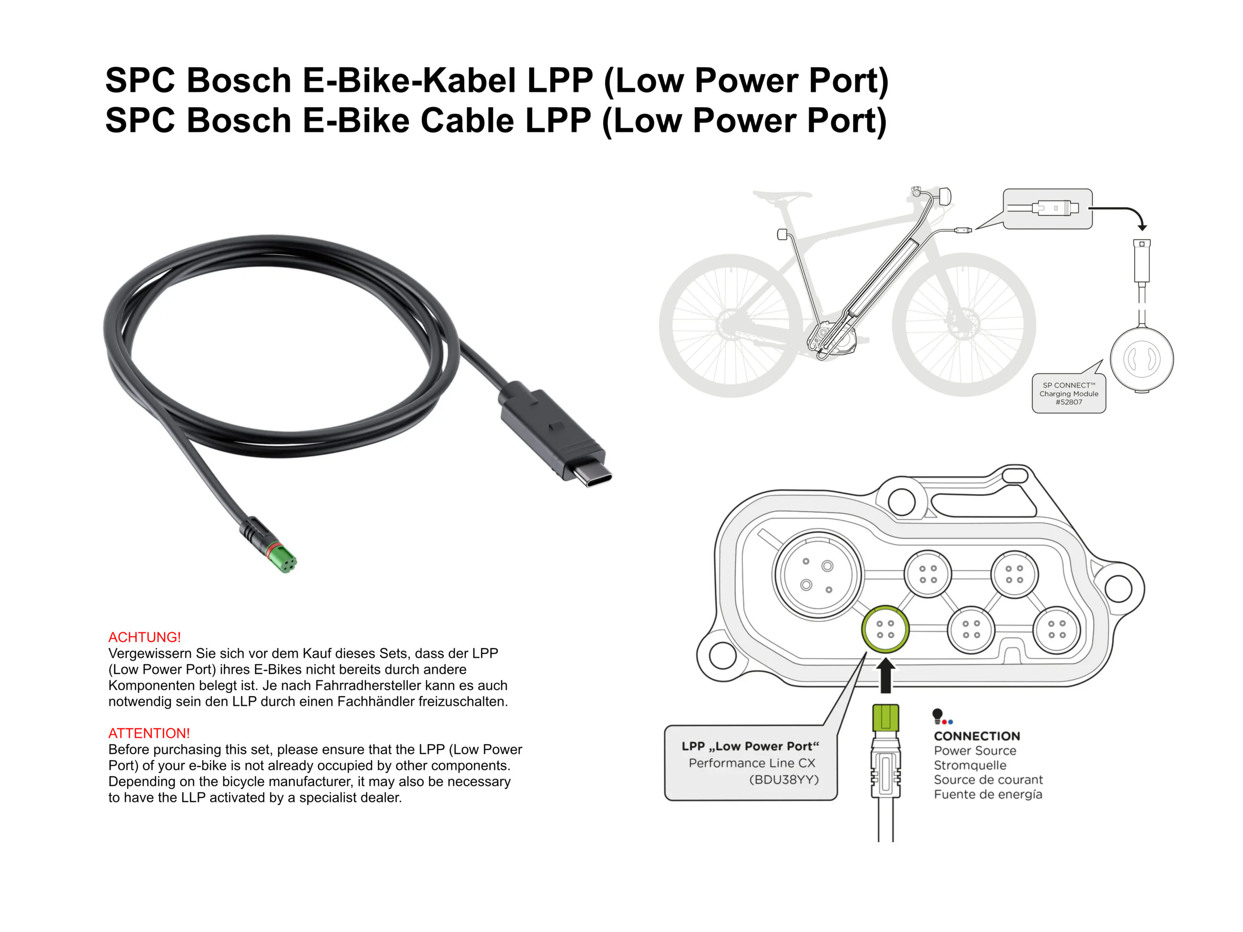 Vergewissern Sie sich vor dem Kauf dieses Sets, dass der LPP (Low Power Port) ihres E-Bikes nicht bereits durch andere Komponenten belegt ist. Je nach Fahrradhersteller kann es auch notwendig sein den LLP durch einen Fachhändler freizuschalten.